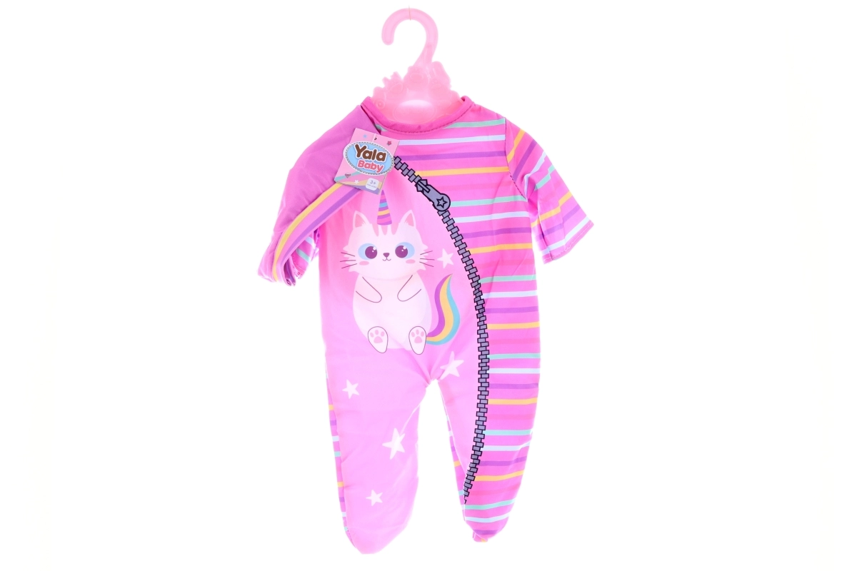 Süßes Puppenkleidungs-Set mit Kätzchenmotiv, bestehend aus bequemen Stramplern und passendem Mützchen. Ideal für Puppen um 32 cm, leicht anzuziehen und perfekt für Kinderspiele und Fantasieentwicklung. Weiches Material, praktische Verpackung am Kleiderbügel und niedliches Design erfreuen jede kleine Puppen-Mama.