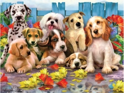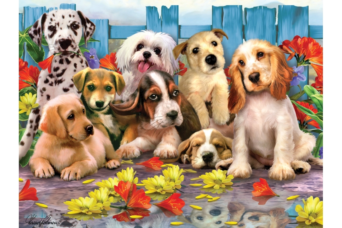Eine farbenfrohe Illustration voller Welpen und Blumen begeistert Kinder wie Erwachsene und lädt zum immer wiederkehrenden Puzzeln ein.