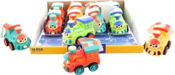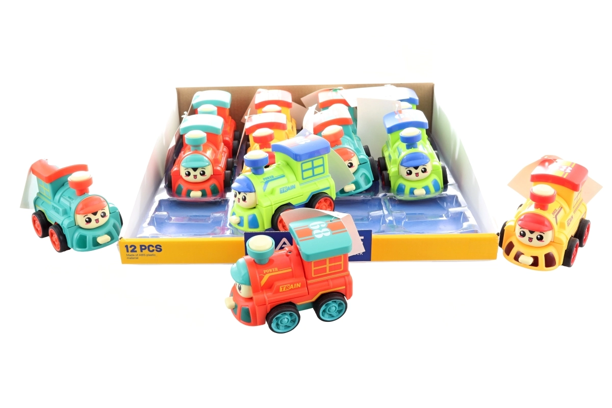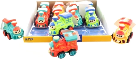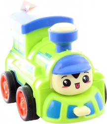 Lustige Lok aus Kunststoff mit Schwungradantrieb, die sich auf Knopfdruck in einen Roboter verwandelt. Kompakte Abmessungen 10 × 7 × 7 cm, vier Farbvarianten je nach Verfügbarkeit und sicheres Design für Kinder ab 3 Jahren.