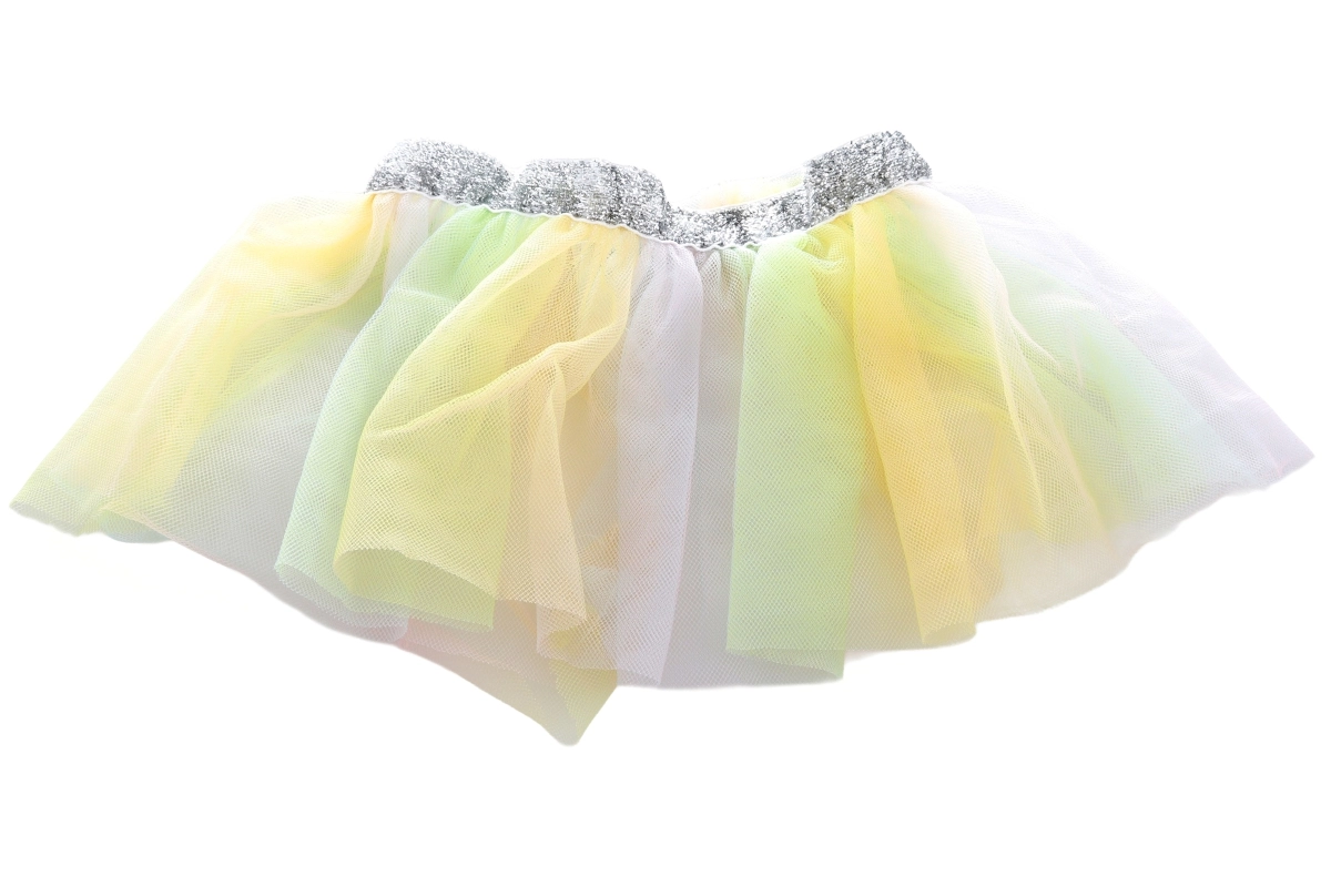 Mehrlagiger Tüll in zarten Regenbogentönen und ein elastischer silberner Bund sorgen für angenehmen Tragekomfort und einfaches Anziehen.