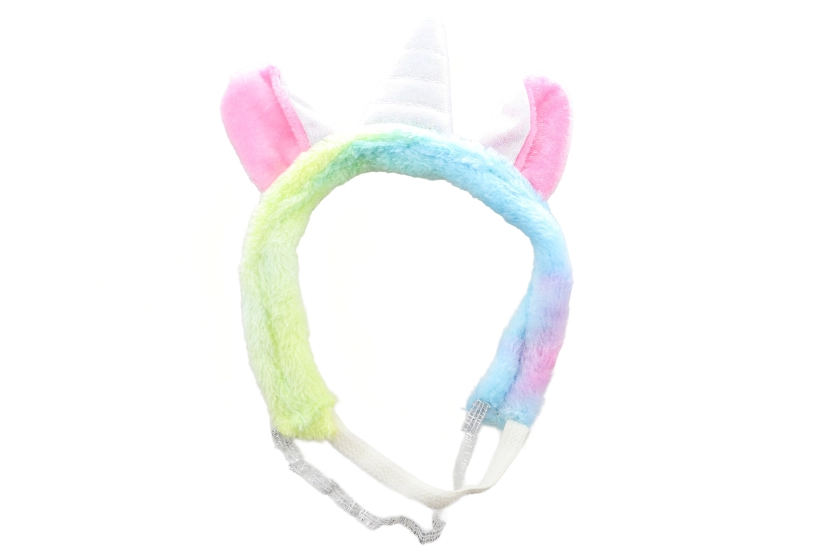 Das plüschige Haarband mit weißem Horn und pastelligem Band rundet das Outfit ab und verwandelt die Puppe in ein kleines Einhorn.