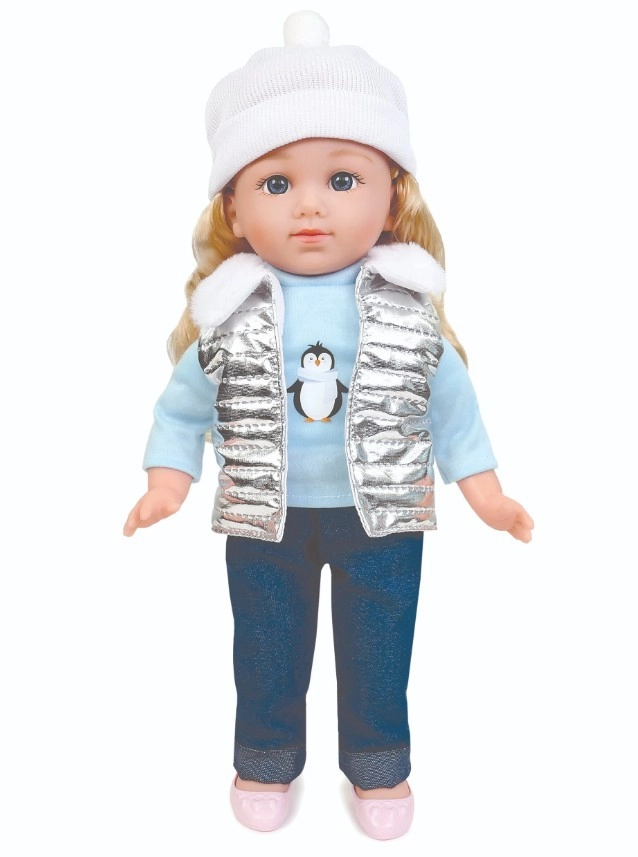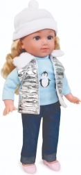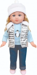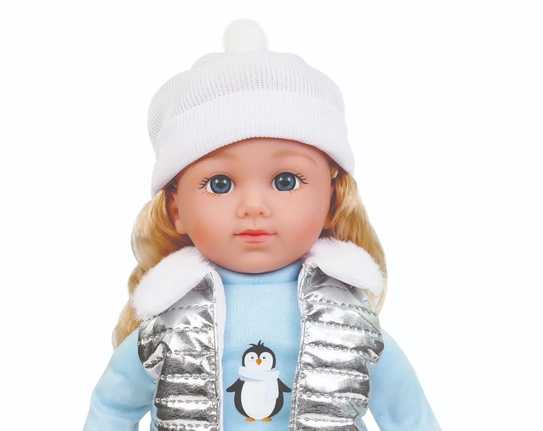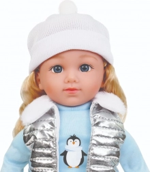 Puppe Natalia mit weicher weißer Mütze, silberner Steppweste mit Fellkragen, hellblauem T-Shirt mit Pinguinmotiv, dunkler Hose und rosa Schuhen ist eine tolle Gefährtin für den Alltag. Beim Drücken des Bauches spricht sie polnische Sätze und singt 2 Melodien, was Rollenspiele unterstützt und die Fantasie anregt.