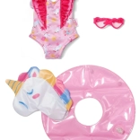 Gönnen Sie der BABY born Puppe 43 cm einen stylischen Tag am Wasser. Der Badeanzug mit zauberhaftem Einhornmotiv und Rüschenärmeln verleiht der Puppe einen zarten Look, während der aufblasbare Schwimmring in Einhornform für viel Badespaß im Pool und in der Badewanne sorgt. Die Herz-Sonnenbrille und die niedlichen Pantöffelchen runden das perfekte Sommer-Outfit ab.