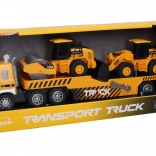 Erlebt realistisches Spiel mit einem Set, das einen großen Sattelzug mit Auflieger und zwei Baumaschinen – eine Walze und einen Radlader – kombiniert. Der Transporter verfügt über Motorsound, Rückfahrgeräusch, Hupe und einen Effekt für das Kippen der Rampe. Dank des Schwungrads fährt der Transporter leicht an und rollt natürlich aus.