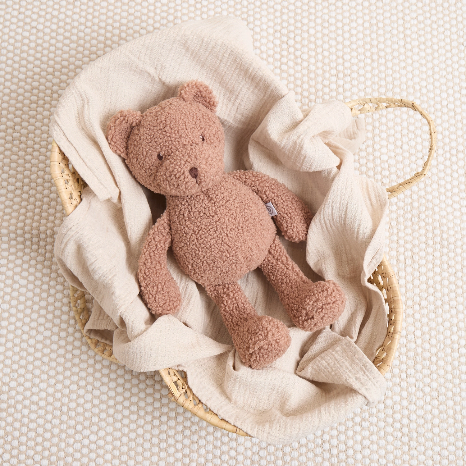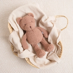 Teddybär Mika ist ein klassischer Plüschfreund mit einem Hauch Nostalgie, der nie aus der Mode kommt. Der flauschige Bouclé-Stoff in Schokoladenbraun lädt zum Kuscheln ein, und seine weiche Füllung bietet Unterstützung beim Ausruhen und Einschlafen. Dank der längeren, frei baumelnden Gliedmaßen ist er angenehm nachgiebig und schmiegt sich bequem in die Arme.
