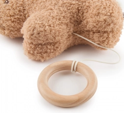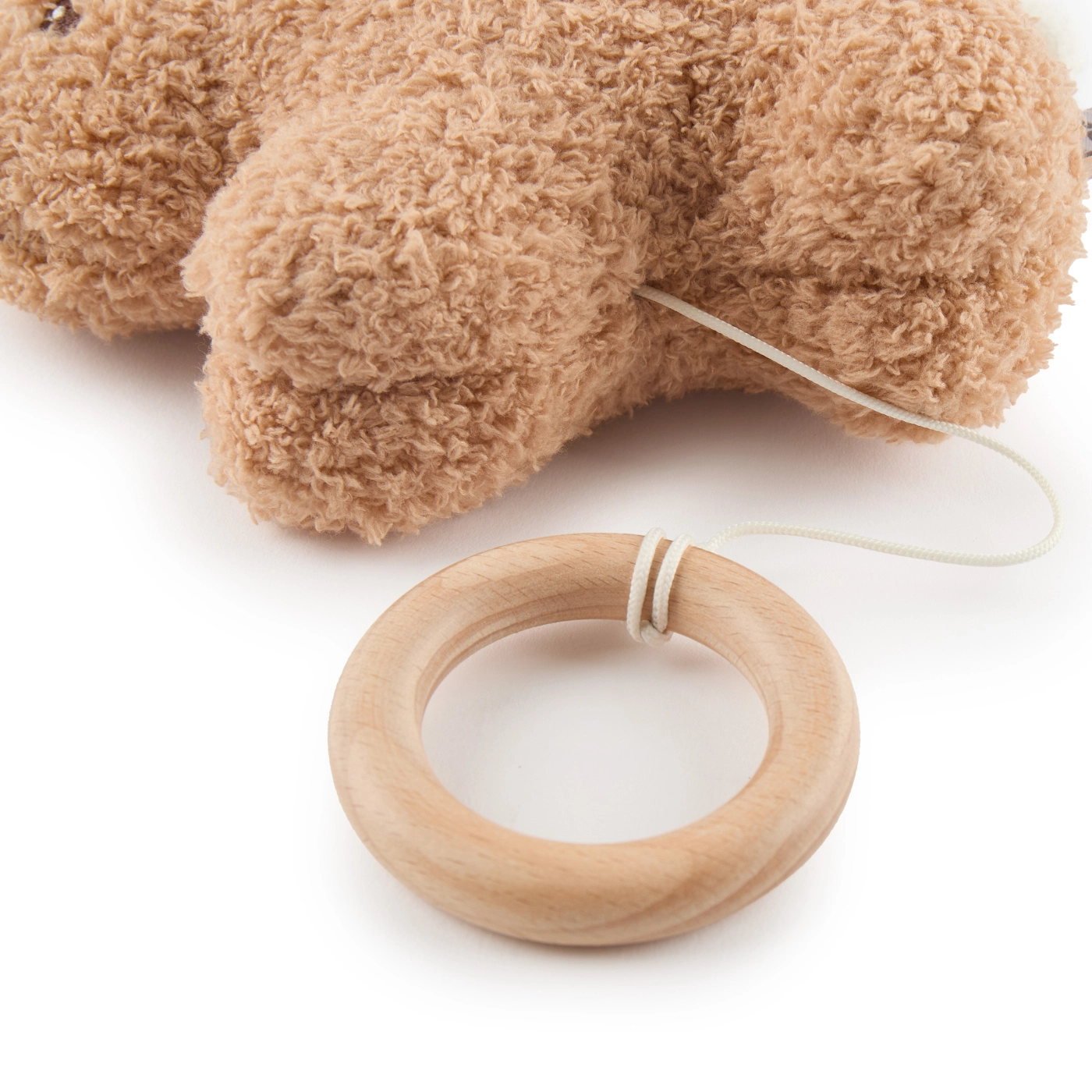 Die weiche Oberfläche lädt zum Kuscheln ein, und der glatte Holzring liegt gut in kleinen Händen und lässt sich bequem daran ziehen.