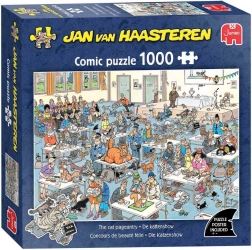Entdecken Sie die humorvolle Welt mit dem Puzzle JUMBO Jan van Haasteren – Katzenausstellung. Der Künstler ist bekannt für seinen markanten Stil mit vielseitigen Details, lustigen Situationen und einer Fülle an Figuren, die bei jedem Zusammensetzen aufs Neue amüsieren. Erfahrene Fans suchen nach ikonischen Elementen wie der Haifischflosse, umherschweifenden Händen, der Zahnprothese, dem Heiligen Nikolaus und sogar dem Porträt des Künstlers.