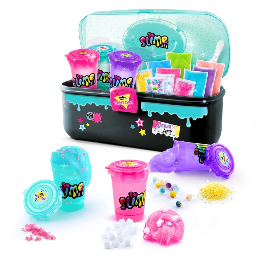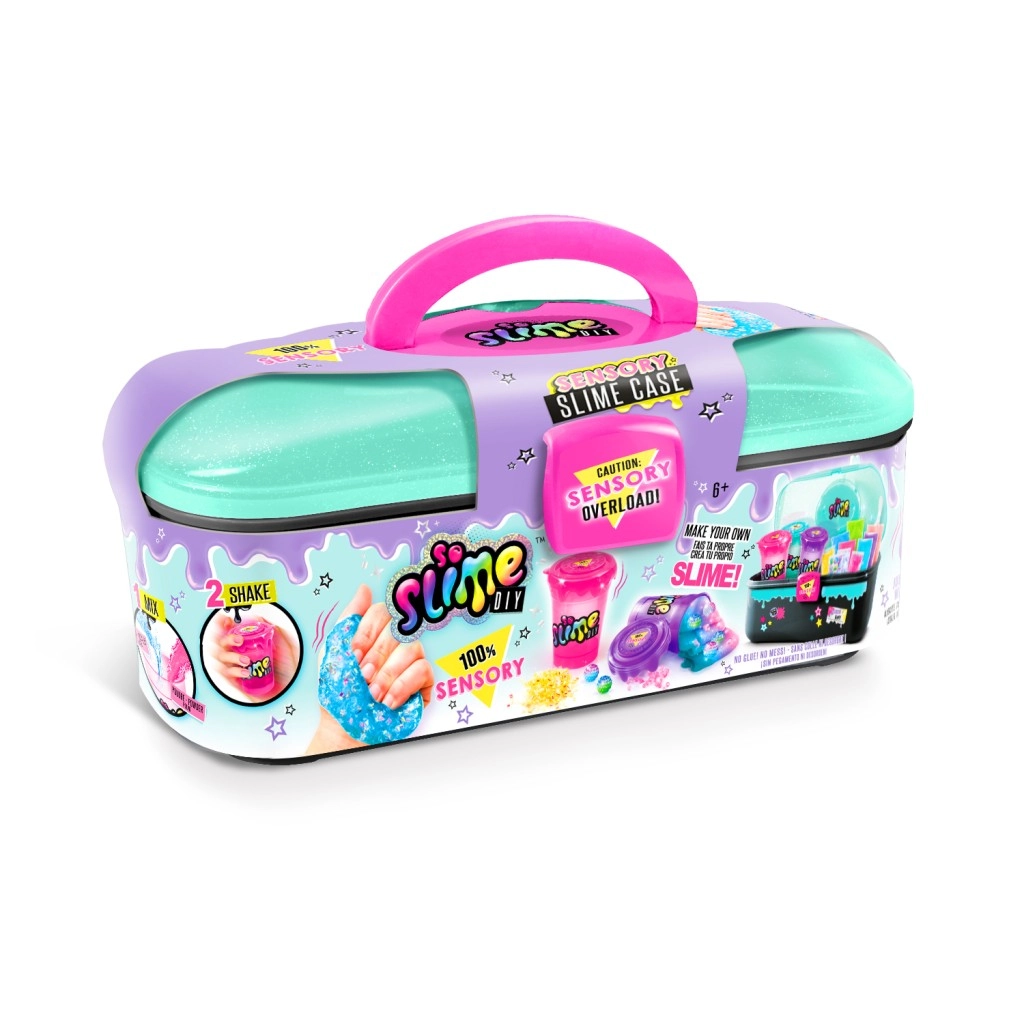 Der kompakte SO SLIME Koffer enthält alles, was Kinder für die sofortige Herstellung farbenfroher und glitzernder Schleime benötigen. In wenigen einfachen Schritten entstehen originelle Kombinationen aus Farben und Texturen, die mit beiliegenden Dekorationen verziert werden können.