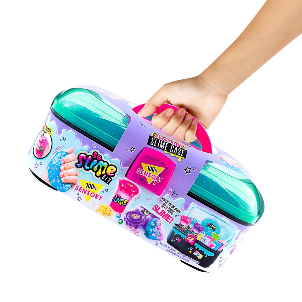 Leichter und robuster Koffer mit Griff hält Schleime und Zubehör übersichtlich zusammen und ist bereit für unterwegs.