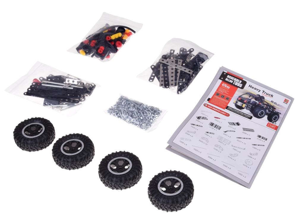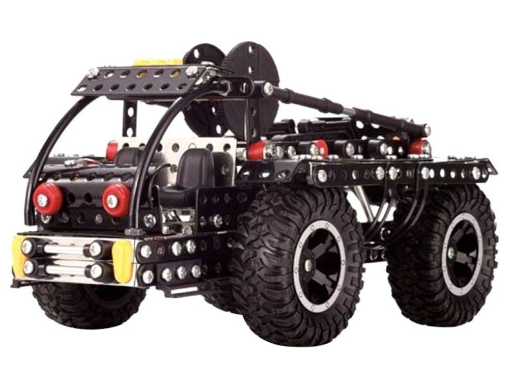 Dieser robuste Metall-Baukasten begeistert Kinder ab 8 Jahren, Teenager und Erwachsene, die Herausforderungen und kreatives Bauen lieben. Durch die Kombination aus Metallleisten, Trägern und Verbindern mit Kunststoffteilen und großen Gummireifen wirkt das fertige Modell realistisch und ist stabil.
