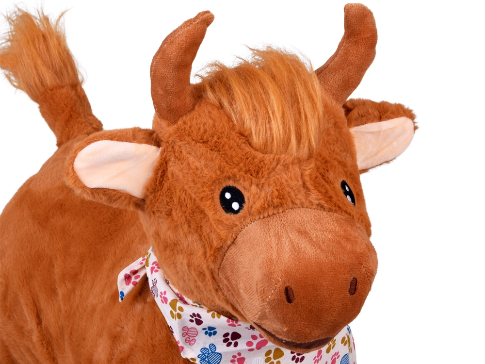 Der Hüpf-Stier ist angenehm weich im Griff, mit sicher aufgestickten Augen, kleinen Hörnern und einem flauschigen Schwanz. Einfach den Reißverschluss am Bauch öffnen, den Einsatz hineinlegen und mit der beiliegenden Pumpe aufpumpen – schon ist er im Handumdrehen bereit für Abenteuer. Das Halstuch mit verspieltem Pfotenmuster verleiht ihm einen originellen Look, den Kinder lieben.
