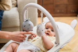 Der abnehmbare Spielbogen mit zwei weichen Spielzeugen fördert visuelles Folgen, Hand-Auge-Koordination und die ersten Greifversuche.