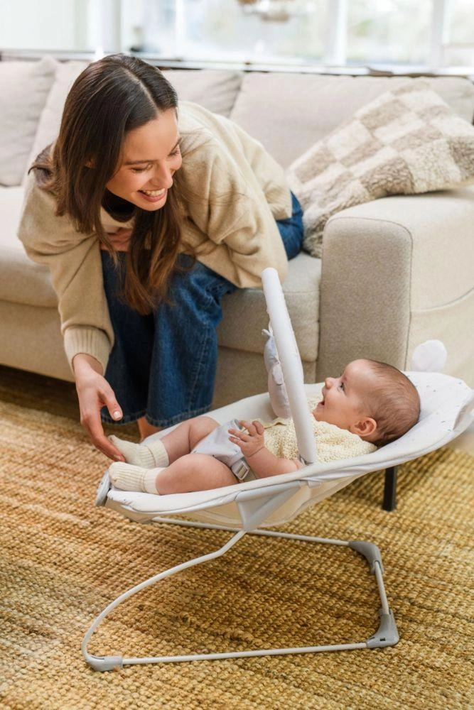 Der abnehmbare Spielbogen mit zwei Spielzeugen unterstützt die visuelle und motorische Entwicklung des Kindes. Der Bezug lässt sich leicht abnehmen und in der Maschine waschen, sodass die Wippe mühelos sauber bleibt. Rutschfeste Fußkappen und ein robuster Rahmen bieten Sicherheit auf verschiedenen Oberflächen.