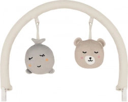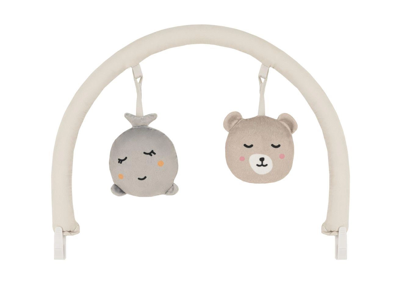 Der abnehmbare Spielbogen mit zwei weichen Spielsachen stimuliert Sehen, Tasten sowie die Hand-Auge-Koordination.