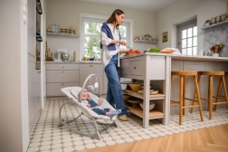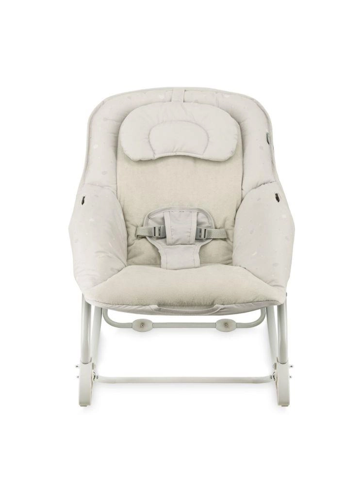Für Sicherheit sorgen ein 3-Punkt-Sicherheitsgurt und ein breiter Schrittgurt; der stabile Rahmen ermöglicht zudem die Arretierung des Schaukelns. Praktische, abnehmbare und waschbare Bezüge erleichtern die Pflege. Der Spielbogen mit zwei weichen Spielzeugen unterstützt die sensorische Entwicklung und beschäftigt das Baby, wenn Sie freie Hände benötigen.