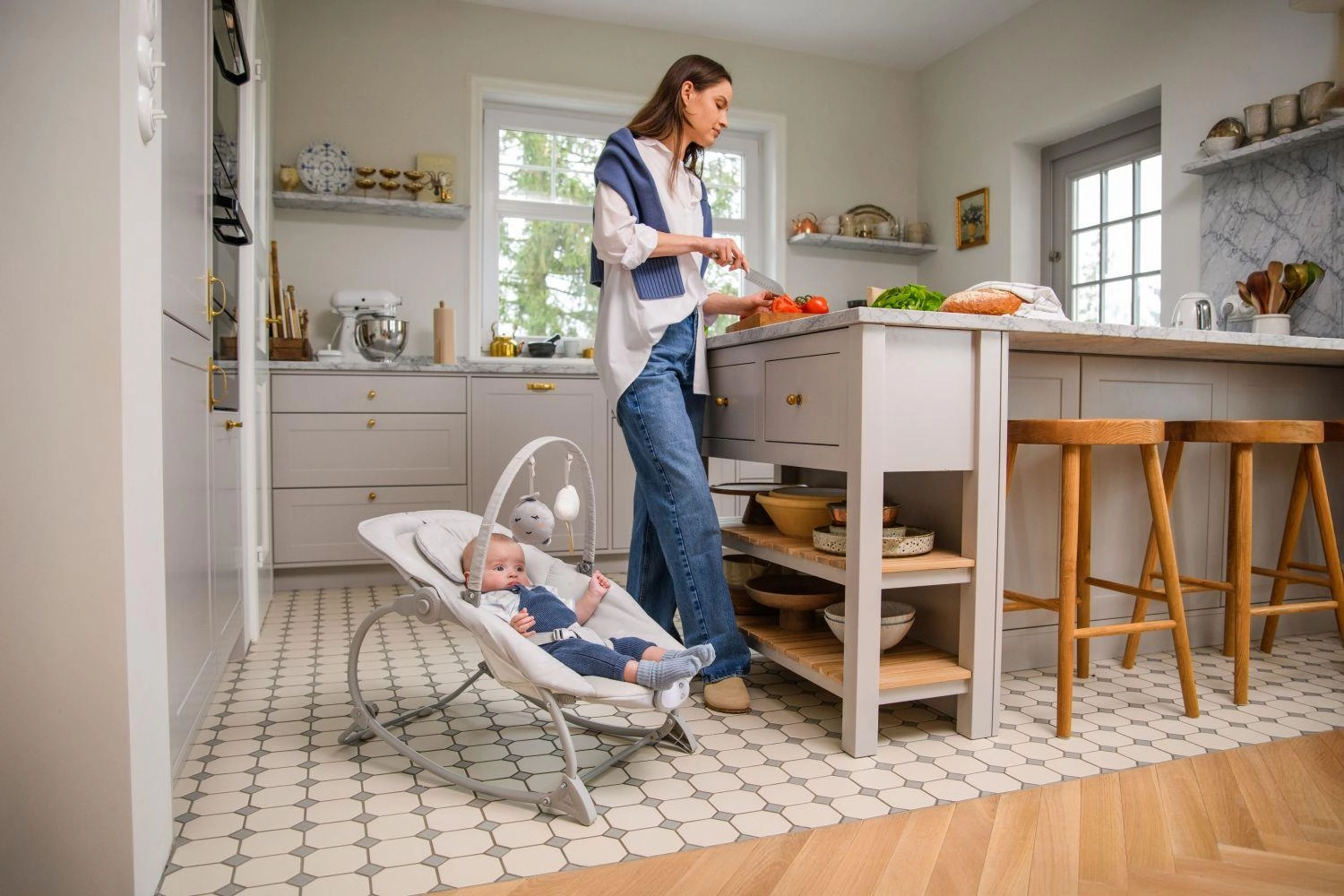 Die stabile Konstruktion, der 3-Punkt-Gurt und die Möglichkeit, das Schaukeln zu arretieren, erhöhen die Sicherheit. Der Spielbogen mit zwei weichen Spielzeugen fördert die Sinne und beschäftigt das Baby.