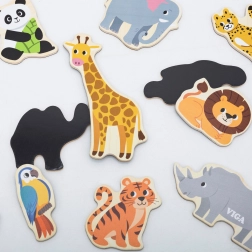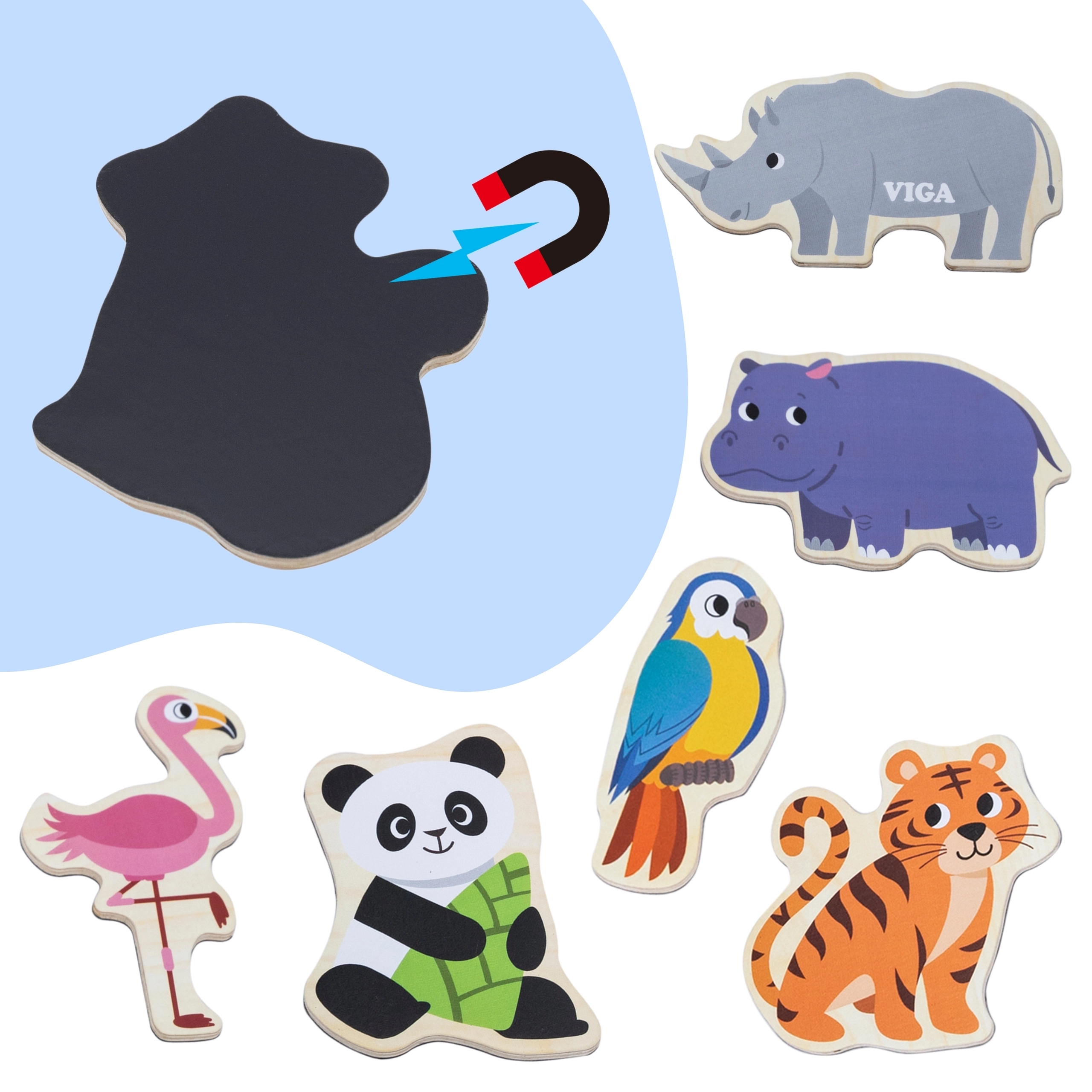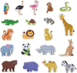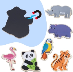 Das Set der Holzmagnete VIGA – Wildtiere bringt fröhlichen und lehrreichen Spielspaß. Realistisch illustrierte Stücke wie Löwe, Giraffe, Krokodil oder Papagei regen Gespräche, das Kennenlernen der Welt und erste Geschichten an. Dank der starken Magnetbeschichtung haften sie am Kühlschrank, an Magnettafeln und anderen Metallflächen.