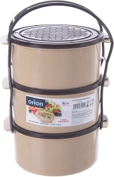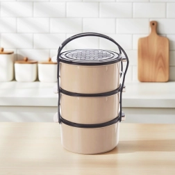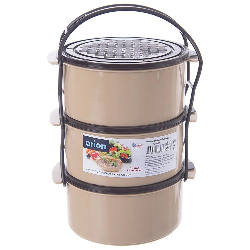 Dieser mehrstöckige Speisenträger ermöglicht den bequemen Transport eines kompletten Mittagessens – Suppe, Hauptgericht und Beilage – in getrennten Behältern. Der robuste Rahmen mit seitlichen Schnallen hält alle drei Schalen fest zusammen, der obere Griff erleichtert das Tragen. Jeder Behälter hat einen eigenen Deckel und 1,5 l Volumen – ideal für Portionen für die ganze Familie.