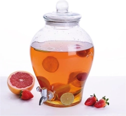 Der elegante Getränkespender aus Glas mit 6,5 Litern Fassungsvermögen bietet eine praktische und hygienische Möglichkeit, Wasser, hausgemachte Limonaden, Eistee oder Punsch zu servieren. Das transparente, dickwandige Glas ist lebensmittelecht und geschmacksneutral, der Metallzapfhahn ermöglicht komfortables Zapfen ohne Verschütten.