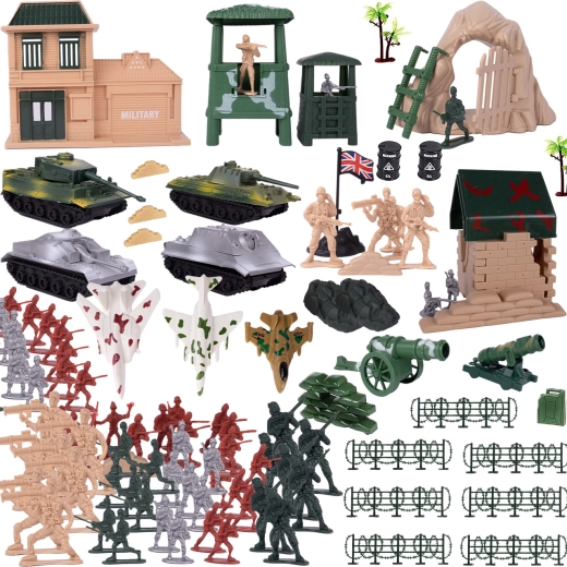 Dieses umfangreiche Armee-Set bietet Kindern stundenlangen Spielspaß und Raum, spannende Kampfszenen zu gestalten. In der Packung finden Sie eine bunte Auswahl an Zubehör: Soldatenfiguren, Flugzeuge, Panzer, Barrikaden, Bauten, Beobachtungsposten, Waffen und vieles mehr. Dank der praktischen transparenten Reißverschlusstasche bleibt alles beisammen und ist reisefertig.