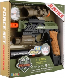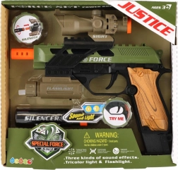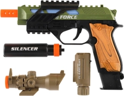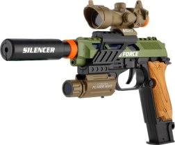 Diese Plastikpistole begeistert jeden kleinen Abenteurer. Dank realistischer Optik und Licht- und Soundeffekten bringt sie mehr Spaß und Action in jedes Spiel. Enthalten sind ein Zielgerät, Licht und ein Schalldämpfer, die den authentischen Eindruck beim Spielen unterstreichen.