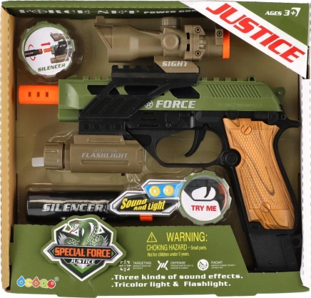Plastikpistole für Kinder mit Licht, Sound und Zubehör (Zielgerät, Licht, Schalldämpfer). Batterien enthalten. Verpackungsmaße 25×23×5 cm. Geeignet ab 3 Jahren.