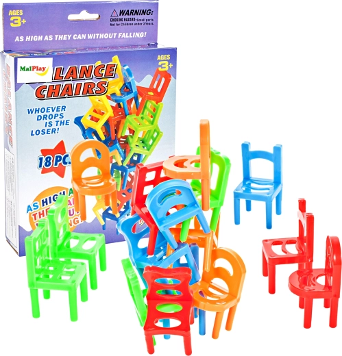 Das Spiel Fallende Stühle ist ein fesselndes Geschicklichkeits- und Familienspiel für Klein und Groß. Ziel ist es, die Stühlchen clever zu platzieren und zu stapeln, um möglichst schnell alle eigenen Teile loszuwerden. Jeder Spieler hat seine Farbe und jede Runde bringt neue Spannung, wem der Turm als Erstes fällt.