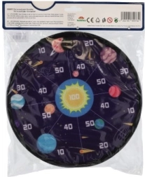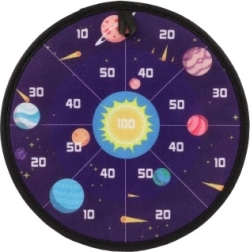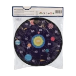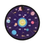 Eine Seite der Scheibe ist mit ansprechenden Farben und Zahlen für das traditionelle Spiel gestaltet, während die andere Seite ein Weltraumthema mit Planetenmotiven bietet. Kinder können beim Addieren der Punkte, die durch einzelne Würfe erzielt werden, Mathematik üben.