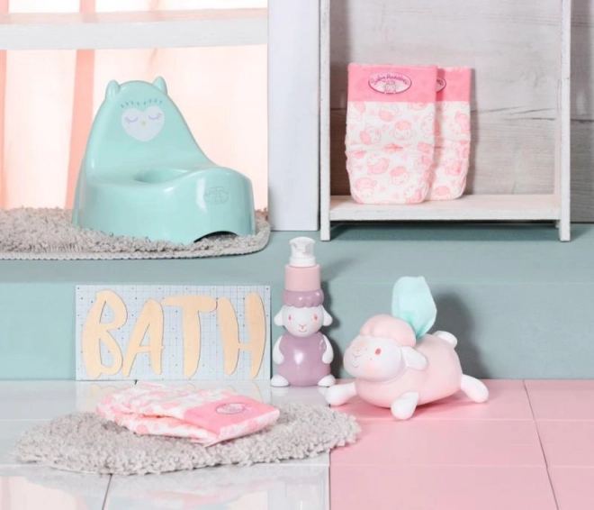 Das **Baby Annabell Töpfchen-Set** ist ideal für kleine Puppenmütter, die ihrer Baby Annabell beim Erwachsenwerden helfen möchten. Das Set besteht aus einem mintgrünen Töpfchen mit einem niedlichen Eulenmotiv auf der Rückseite, das mit charmanten Öhrchen verziert ist, und dient als perfekte Stütze für die Puppe.