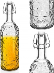 Elegante Glasflasche im Retro-Stil mit 750 ml Fassungsvermögen – ideal zum Servieren und Aufbewahren von Wasser, hausgemachter Limonade, Wein, Likören und Fruchtsirupen. Der Bügelverschluss mit Metallclip und Silikondichtung gewährleistet perfekte Dichtheit, verlängert die Frische der Getränke und verhindert unbeabsichtigtes Auslaufen.