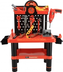 Die Arbeitsplatte mit Bohrlöchern, Platz für einen Schraubstock und aufgedruckter Skala unterstützt realistisches Spiel und die Entwicklung der Feinmotorik.