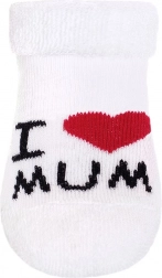 Diese weißen Frotteesocken für Babys verbinden hochwertige Verarbeitung, Komfort und niedriges Design mit den Motiven I ♥ MUM / I ♥ DAD. Das weiche, wärmende Frotteematerial ist sanft zur empfindlichen Haut und hält die Füßchen auch an kühleren Tagen warm.
