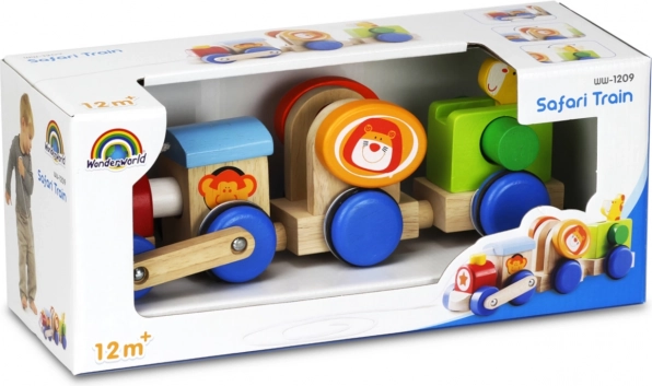 Der Safari-Zug ist das ideale Spielzeug für Kinder ab 12 Monaten, die kreative Spiele lieben. Er besteht aus drei bunten Waggons, die Kinder mithilfe der mitgelieferten Schnur leicht ziehen können. Das Spielzeug ist so gestaltet, dass es Spaß macht und gleichzeitig die motorischen Fähigkeiten der Kleinen fördert.