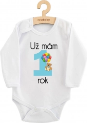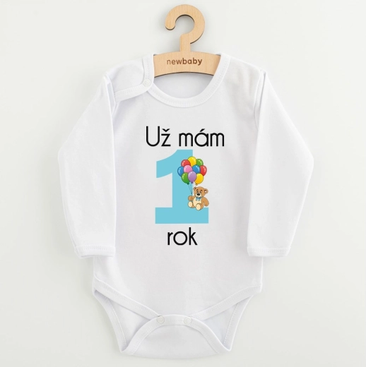 Stilvolles Baby-Body mit langen Ärmeln der Marke NEW BABY mit dem Aufdruck Ich bin schon 1 Jahr alt und einem Motiv einer Eins mit Luftballons. Hergestellt aus 100% Baumwolle mit zertifizierten, babysicheren Farben. Bequemes Druckknopf-Verschluss an der Schulter und im Schritt erleichtert An- und Ausziehen sowie Wickeln.