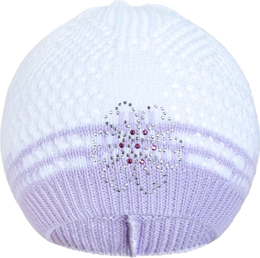 Die stylische gestrickte Mütze NEW BABY in elegantem Lila ist mit einem zarten Blümchen und funkelnden Steinchen verziert. Dank der natürlichen Zusammensetzung ist sie sanft zur Kinderhaut, gut luftdurchlässig und zugleich formstabil.