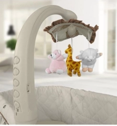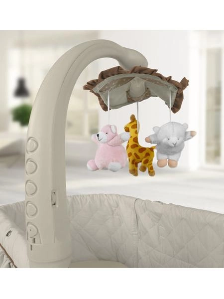 Drei weiche Plüschtiere, angenehme Melodien, optionale Vibrationen und ein dezentes Nachtlicht unterstützen das sanfte Einschlafen des Babys. Alles lässt sich bequem am Modul oder per Fernbedienung steuern.
