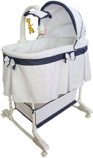 Das integrierte Mobile mit Plüschtierchen und das Elektronikmodul mit Vibrationen, Melodien und Nachtbeleuchtung helfen, das Baby zu beruhigen. Alles stellen Sie bequem per Fernbedienung ein, ohne den Schlaf des Kindes zu stören. Enthalten sind eine weiche Matratze und ein unterer Korb für Windeln und Kleinigkeiten – so haben Sie alles griffbereit.
