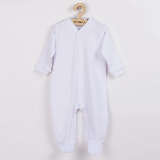 Bequemer und praktischer Baby-Overall New Baby Classic in weißer Farbe, ideal für den täglichen Gebrauch. Hergestellt aus weicher 100 % Baumwolle, die sanft zur empfindlichen Babyhaut ist. Dank des Druckknopfverschlusses über die gesamte Länge und im Schritt lässt er sich leicht anziehen und wickeln.