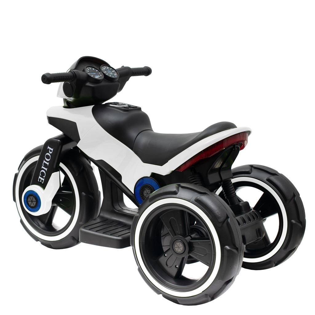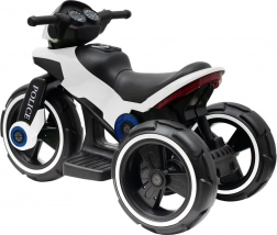 Das elektrische Kinder-Motorrad BABY MIX Police vereint realistisches Design, Komfort und Sicherheit. Dank der zwei leistungsstarken Motoren und dem Antrieb beider Hinterräder genießen Kinder eine stabile Fahrt mit 2–4 km/h. Die Bedienung ist intuitiv – Gaspedal auf dem Trittbrett zum Anfahren und automatisches Anhalten beim Loslassen, die Fahrtrichtung wird per Taste umgeschaltet.