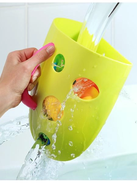 Der integrierte Griff ermöglicht das bequeme Herausnehmen des Korbs aus der Halterung und das Tragen der Spielzeuge an einen Ort, wo sie vollständig trocknen können.