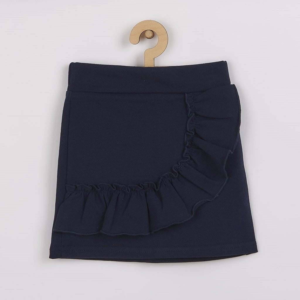 Der dunkelblaue Rock mit Rüsche verleiht dem Outfit Pfiff. Dank des breiteren, elastischen Bundes sitzt er schön und drückt nicht auf das Bäuchlein, was maximalen Tragekomfort den ganzen Tag über gewährleistet. Die Baumwollmischung mit Elasthan passt sich angenehm den Bewegungen des Babys an.