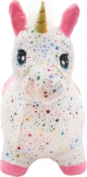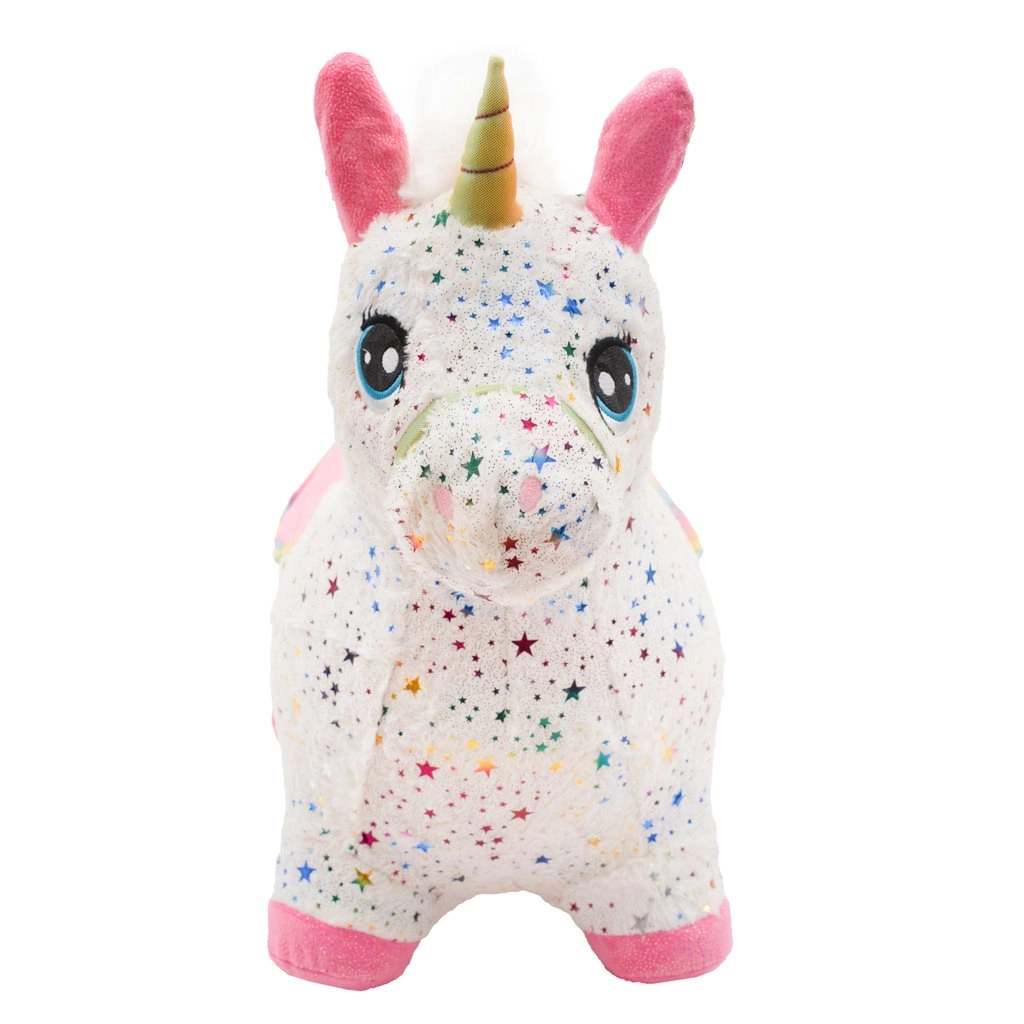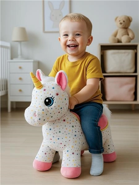 Das plüschige Hüpf-Einhorn PLAYTO verbindet Bewegungsfreude mit Komfort. Der aufblasbare Körper ist mit weichem Plüsch überzogen, der sich angenehm anfühlt und zum Kuscheln einlädt. Beim Drücken zwischen den Ohren erklingt ein realistischer Pferdesound, der die Fantasie und interaktives Spiel unterstützt.