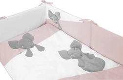 Dieses elegante Set fürs Kinderbett vereint fluffige Materialien und ein sanftes Design, das in jedes Zimmer passt. Rosa-weiße Paneele werden von grauen Tierapplikationen ergänzt und schaffen eine beruhigende Atmosphäre für den ruhigen Schlaf Ihres Babys.