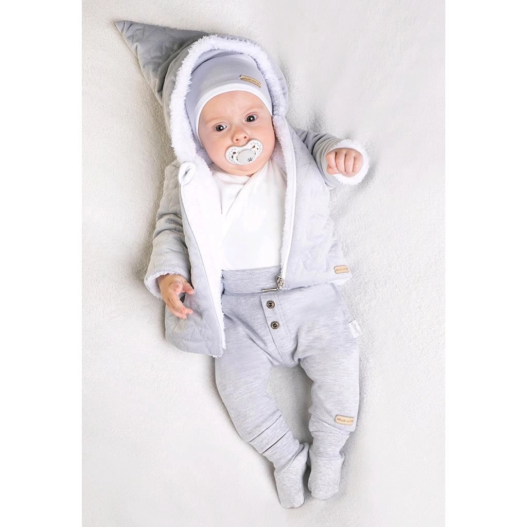Die praktische Kapuze und die umschlagbaren Ärmel schützen vor Kälte, während das verlängerte Rückenteil den Rücken warm hält. Der Reißverschluss über die gesamte Länge erleichtert das An- und Ausziehen. Im Set enthalten ist eine weiche Baumwollmütze, die das Outfit ergänzt und die empfindliche Haut schützt.