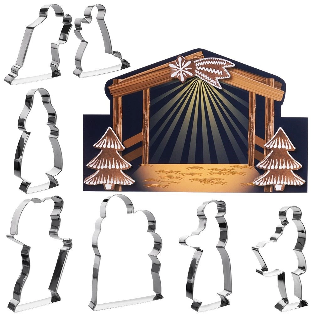 Mit dem Set weihnachtlicher Ausstechformen schneiden Sie mühelos exakte Formen der Krippenfigürchen und Tiere aus und schaffen eine originelle Weihnachtsdekoration sowie leckeres Gebäck. Die Breite der einzelnen Formen beträgt ca. 2–9 cm, die Länge 7–12 cm – ideal für Lebkuchen und Mürbeteig. Das farbige Karton-Hintergrund dient zur Vollendung der gesamten Szene.