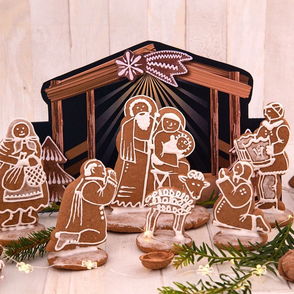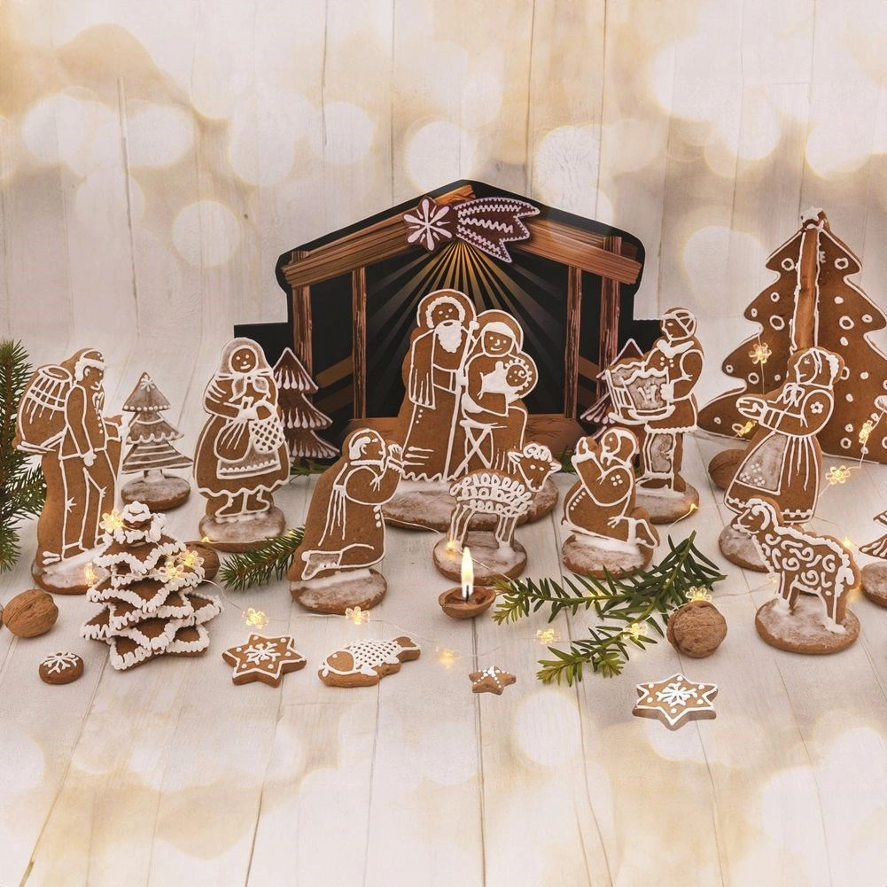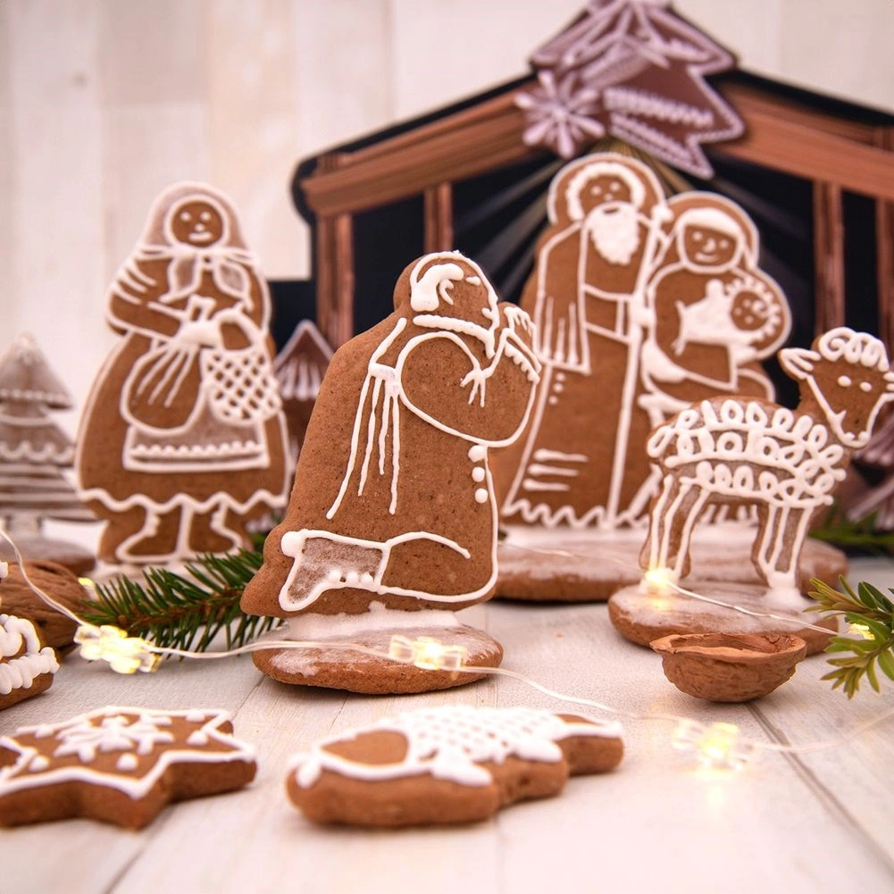 Das Set umfasst die Krippenfiguren sowie ein dekoratives Hintergrundmotiv, sodass Sie nach dem Backen ganz einfach eine wirkungsvolle Weihnachtsdekoration für Tisch oder Fensterbank gestalten.