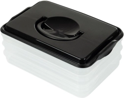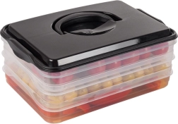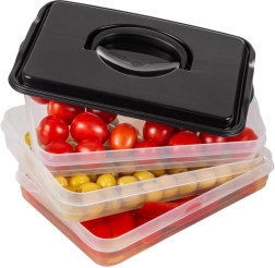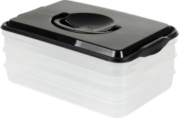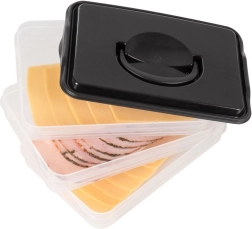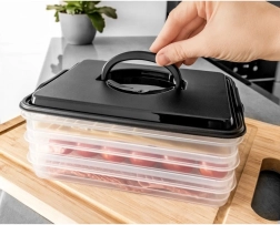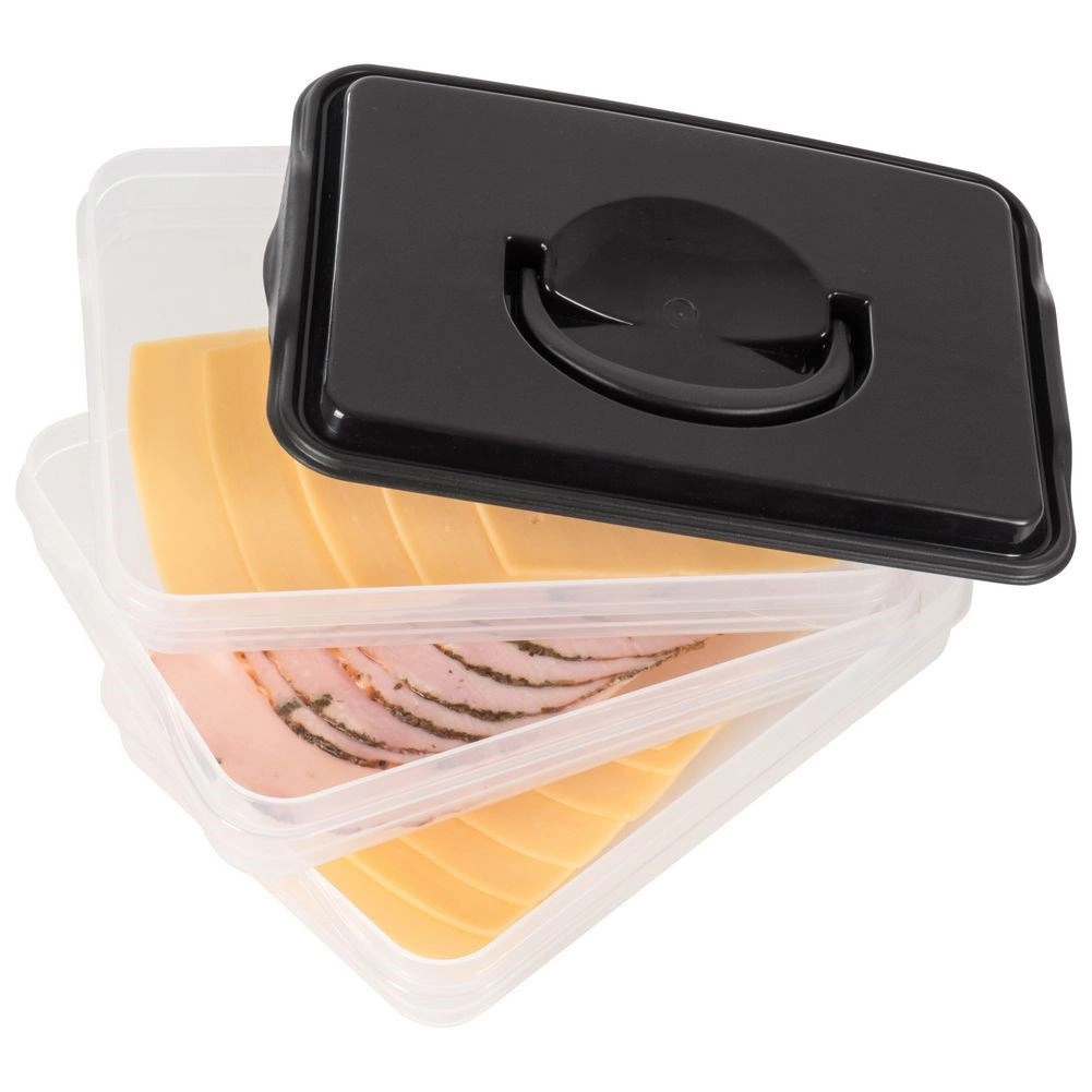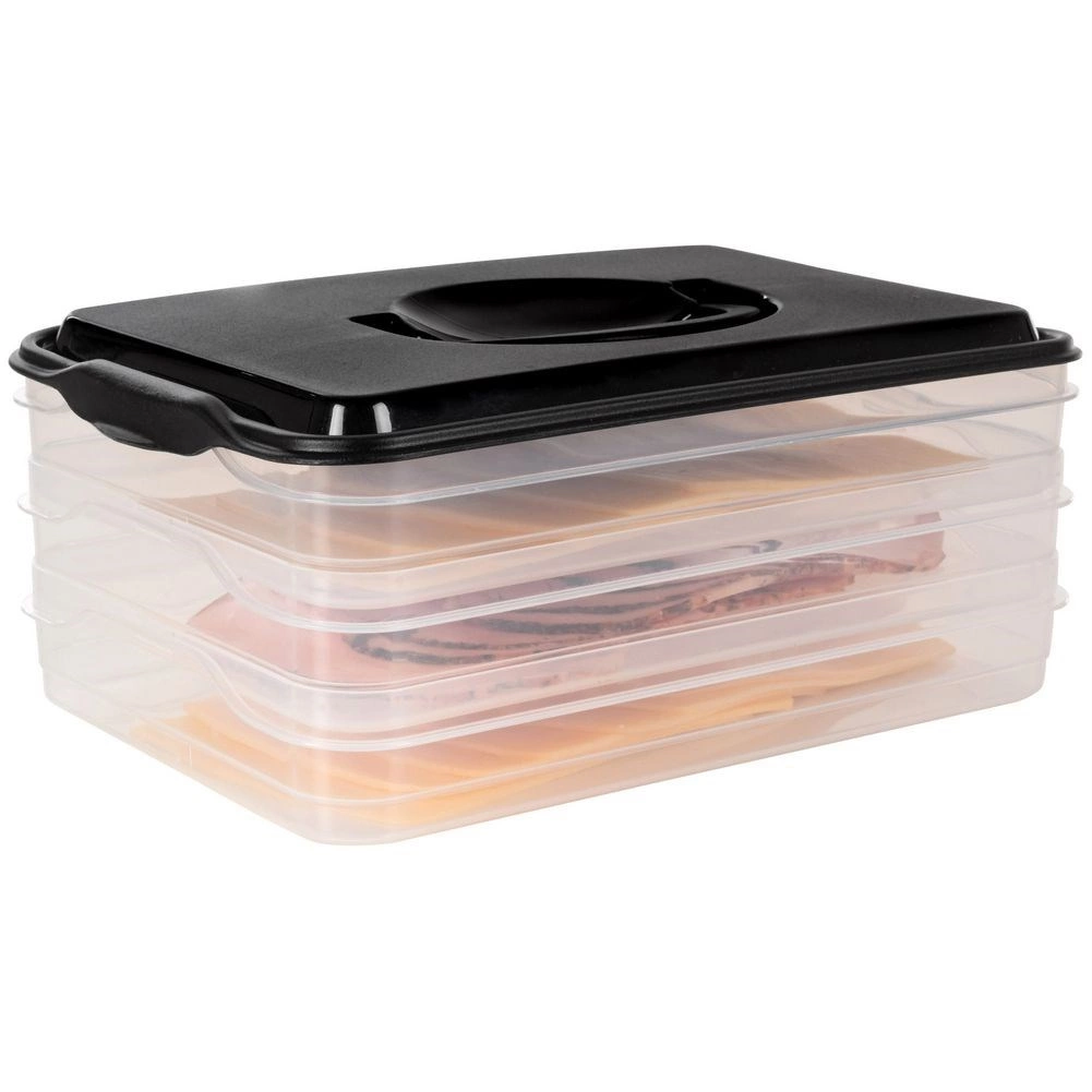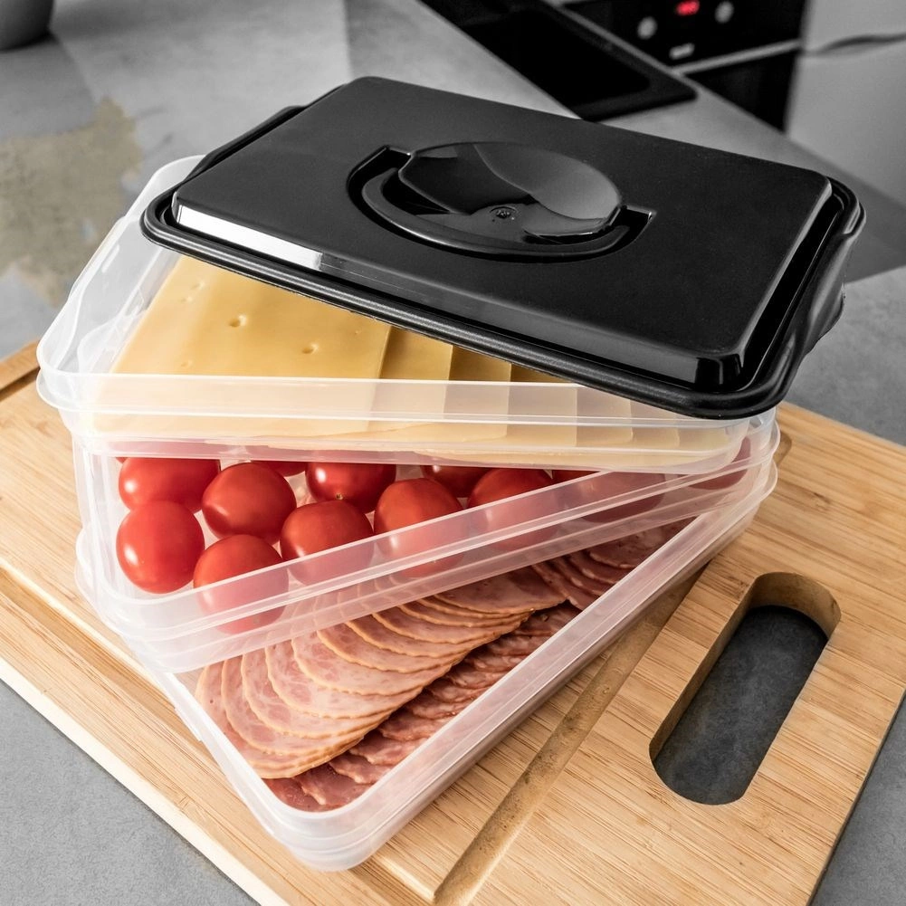 Dieser intelligente Lebensmittel-Organizer bietet drei separate, transparente Ebenen für die bequeme Aufbewahrung von Scheibenkäse, Wurstwaren und kleinen Zutaten ohne Geruchsvermischung. Die kompakte rechteckige Form passt perfekt in Kühlschrankfächer und der robuste schwarze Deckel mit Griff sorgt für einfache Handhabung.