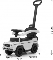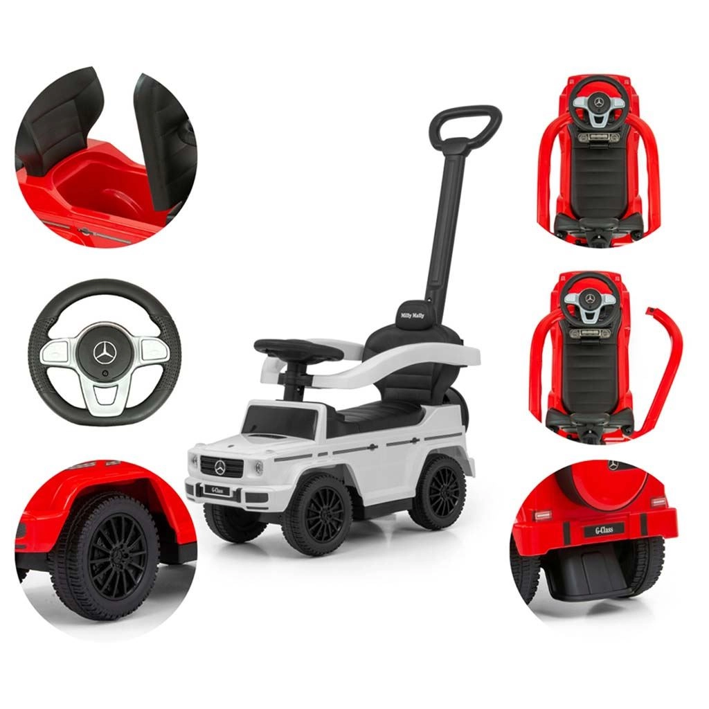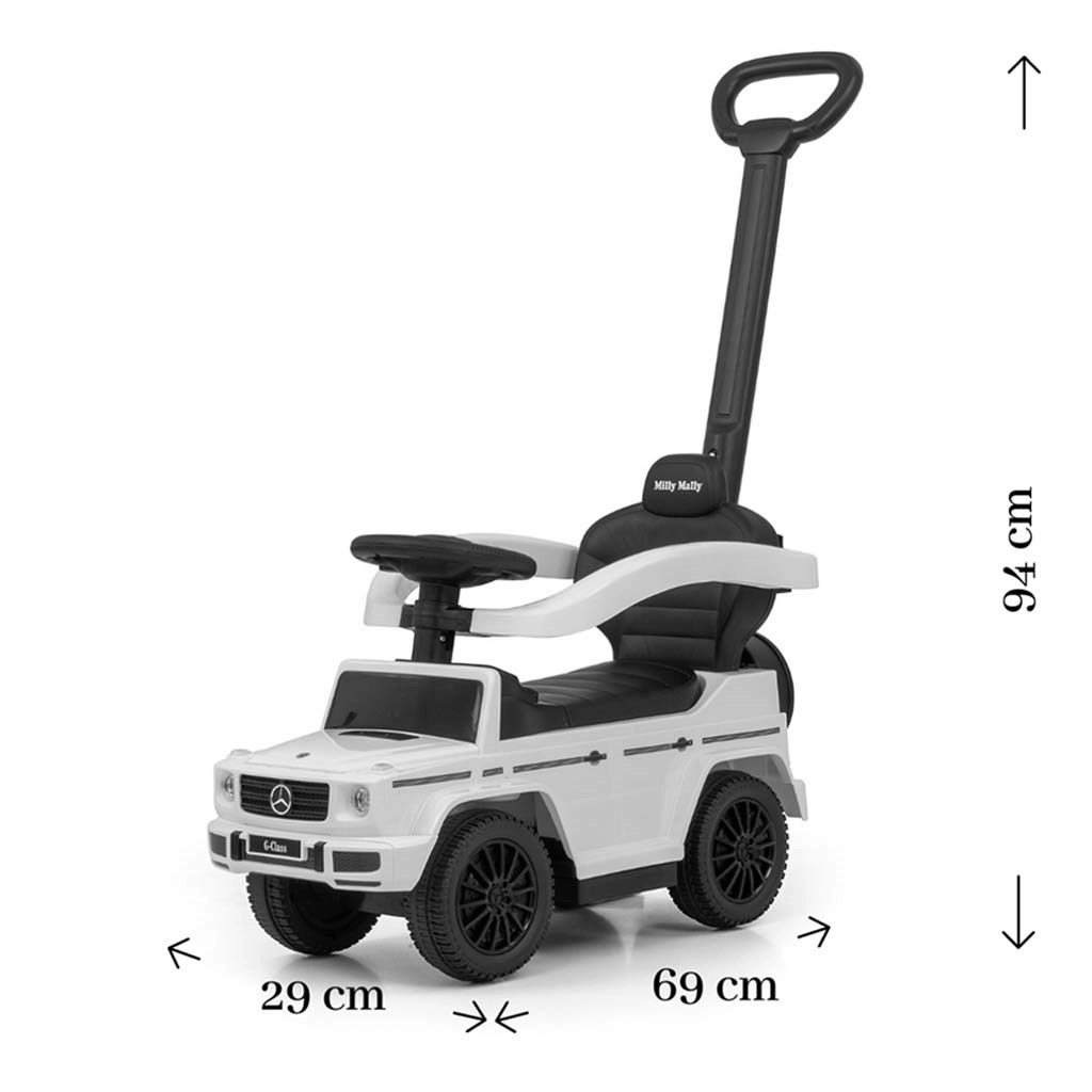 Schenken Sie Ihrem kleinen Fahrer ein authentisches Fahrerlebnis mit dem ikonischen Look der MERCEDES G‑Class. Das Laufrad ist mit Liebe zum Detail und hoher Qualität gefertigt – Metallachsen für mehr Haltbarkeit, ein bequemer Sitz mit Rückenlehne und praktischer Stauraum unter dem Sitz für Kleinigkeiten. Drehbare Vorderräder und die lange Schiebestange ermöglichen Eltern ein einfaches Manövrieren, während Sicherheitsmerkmale Stabilität und Kippschutz gewährleisten.