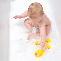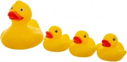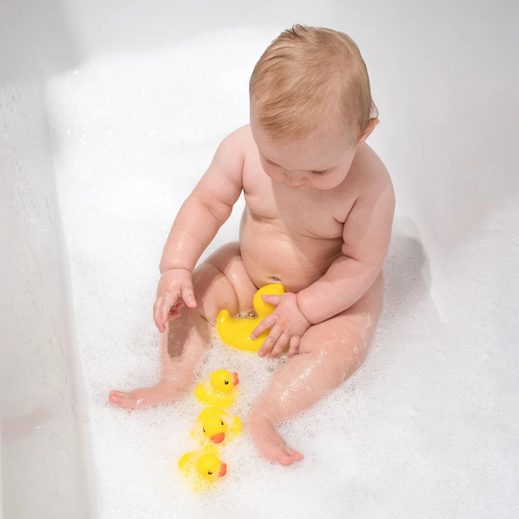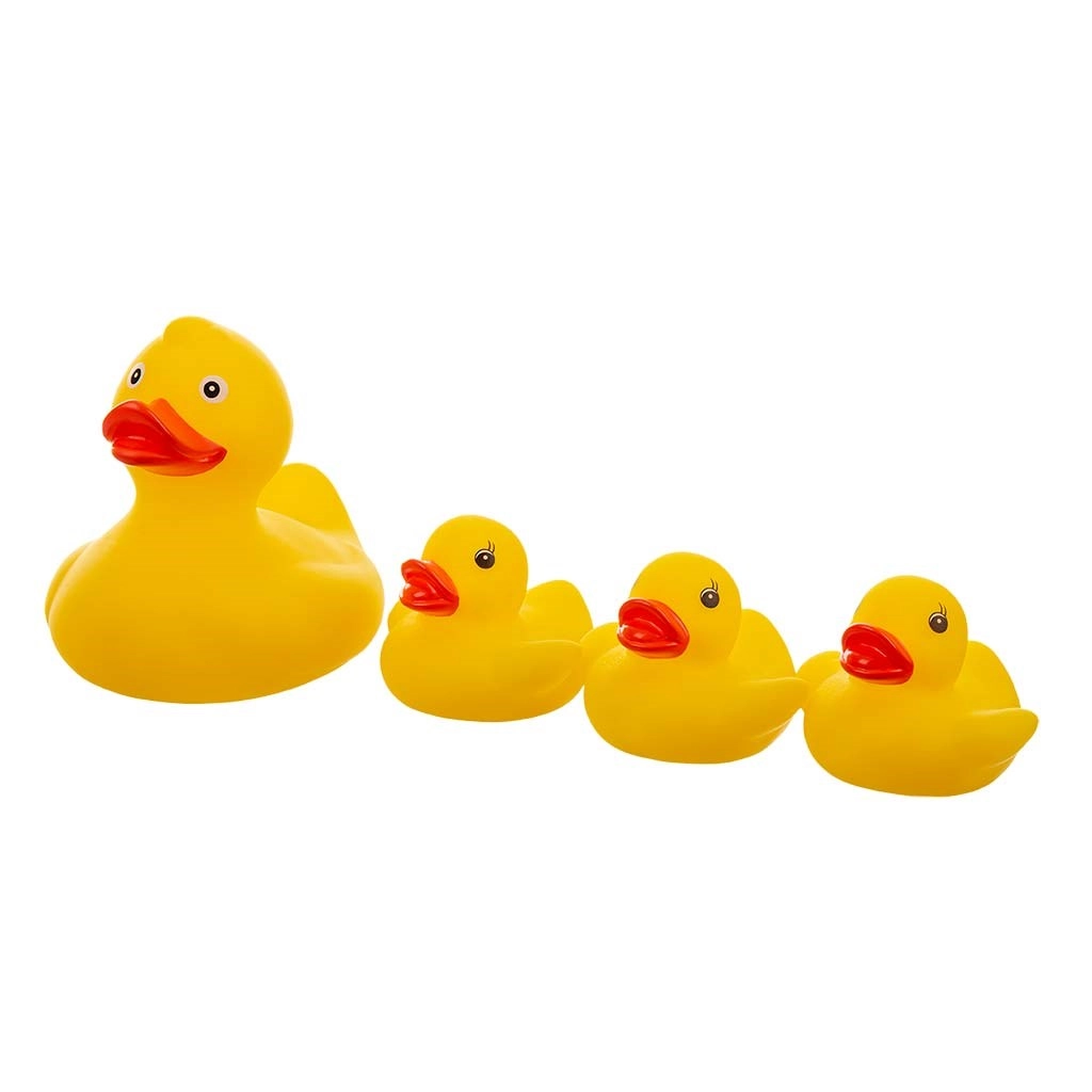 Mit dieser niedlichen Entenfamilie wird jedes Bad zur fröhlichen Auszeit. Das Set enthält 1 große Ente und 3 kleine Entchen, die schwimmen und dank Öffnung Wasser spritzen. Das leuchtende Gelb fördert die visuelle Wahrnehmung und die auf Kinderhände abgestimmte Form trainiert die Feinmotorik.