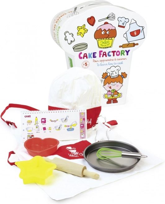 • Komplette Ausstattung: enthält Schürze, Kochmütze, Ausstechform, Schneebesen, Backblech, Teigroller und ein Rezeptbuch.
